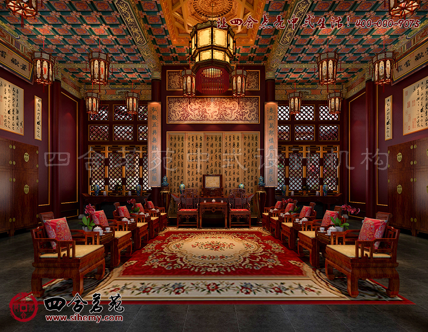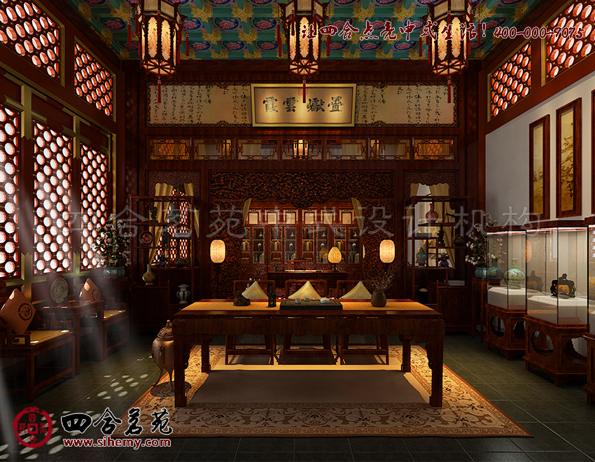 天花裝飾圖形色彩豐富,吊燈配飾古色古香,空間裝飾給人沉穆穩重而幽靜古韻的視覺體驗。