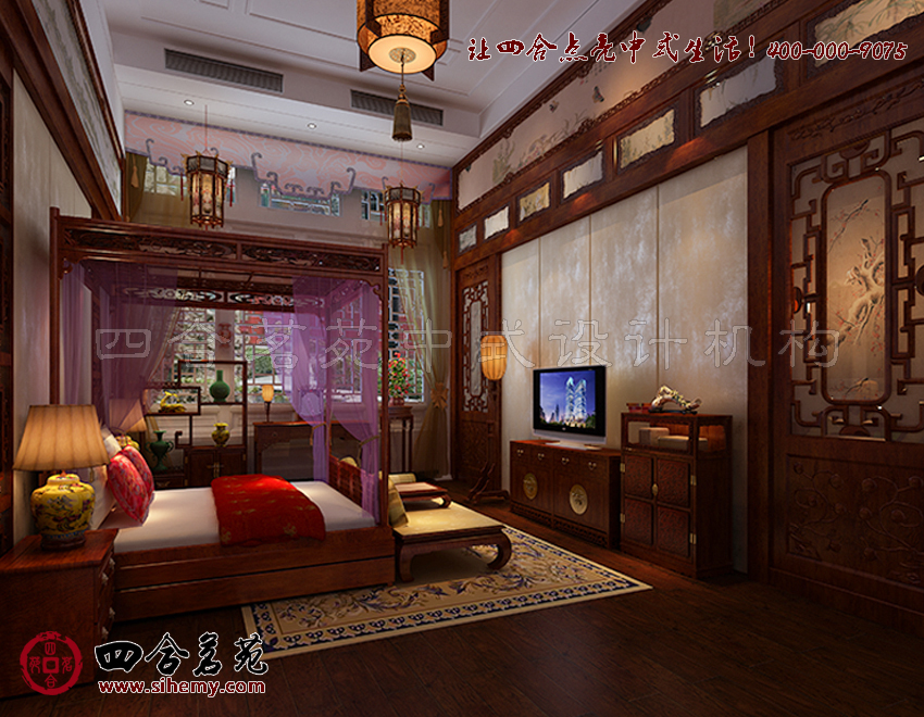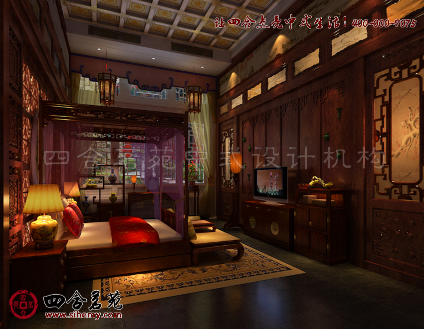 臥室中式設計從裝飾題材和布色施彩入手,輔助家具配飾軟裝等,從色彩上給人帶來古樸與穩重的視覺體驗。